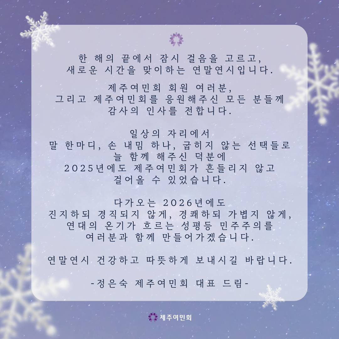 지난 겨울 12.3 불법계엄에 맞서 광장을 지키고, 윤석열 파면과 민주주의 회복을 염원하며 넉달간 투쟁을 이어갔던 노동자, 농민, 시민들을 기억합니다. 윤석열정권퇴진·한국사회대전환 제주행동은 불법계엄 1년을 맞아 지난 겨울 광장의 목소리를 되새기고, 이재명정부에 사회대개혁을 촉구하는 제주도민대회를 개최하였습니다. 이에 제주여민회 사무국은 회원들과 함께 참여하였습니다. |