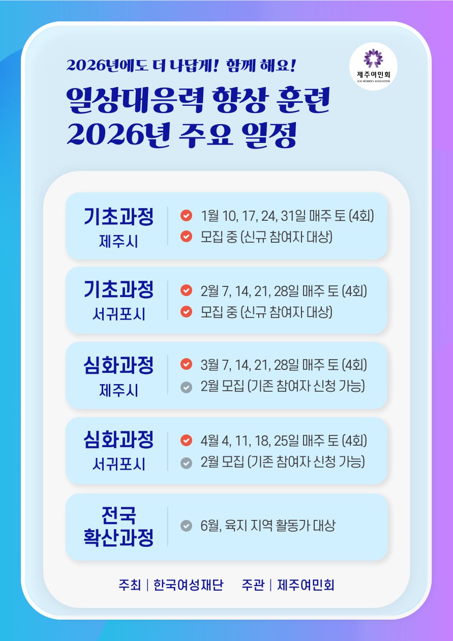제주여민회의 <일상대응력 향상 훈련>이 2026년에도 이어집니다. 26년은 기본과정, 심화과정, 전국 확산과정까지 운영됩니다. 그 첫 시작으로, 제주시 기본과정 참여자를 모집합니다.