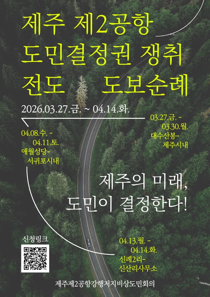 제주 환경을 파괴하고, 주민과 농민 생존권을 위협하며, 수요 예측 오류, 부실 조사 문제, 조류 충돌 위협 등 총체적 문제로 제주 미래를 위협하는 제주 제2공항 문제는 제주도민의 자기결정권 실현을 통해 해결해야 합니다.